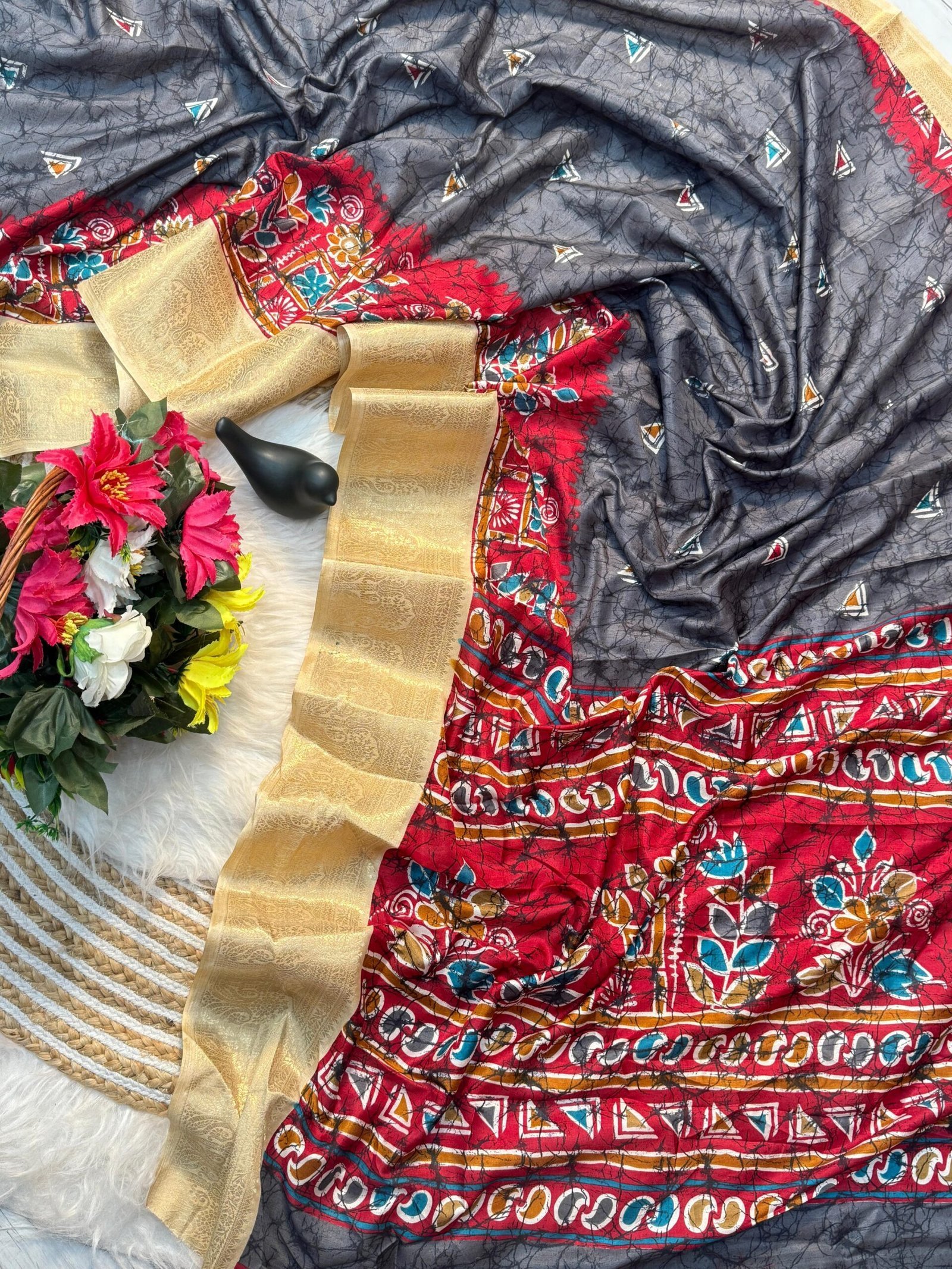 Celebrate timeless elegance with our Ajarakha Prisam Saree, crafted from premium Dola Silk and finished with a luxurious Jacquard border. This saree features a super soft feel, offering a graceful fall and comfort all day long.